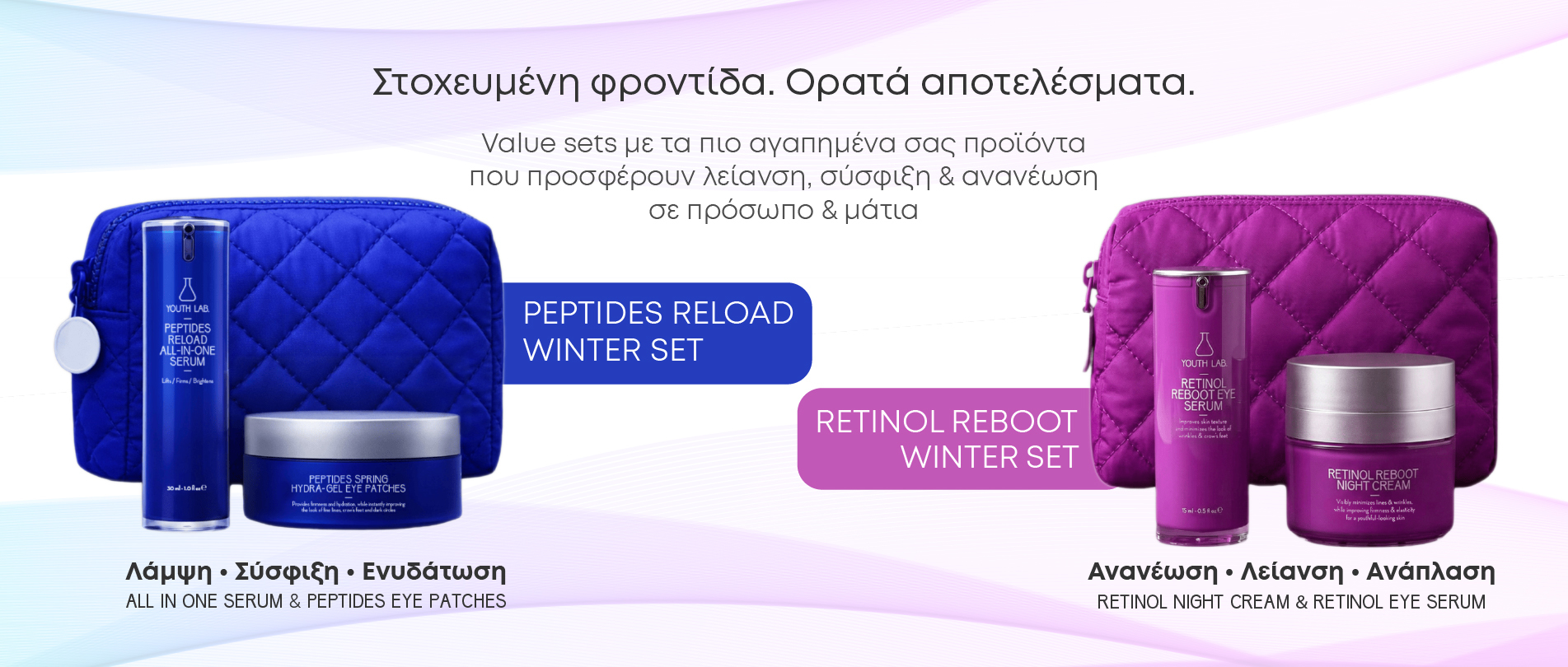 Η επιστημονική ομάδα της YOUTH LAB. αναγνωρίζοντας τη σπουδαιότητα των Πεπτιδίων -δομικό υλικό των συστατικών του δέρματος, όπως είναι το κολλαγόνο και η ελαστίνη- σχεδίασαν τη σειρά Peptides Reload, με σκοπό την ενεργοποίηση των φυσικών μεταβολικών διαδικασιών της επιδερμίδας. Αποτέλεσμα; Η πρόληψη των πρώτων γραμμών και ρυτίδων, αλλά και η αντιμετώπιση των ορατών σημαδιών γήρανσης, όπως βαθιές ρυτίδες, έλλειψη όγκου και πυκνότητας της επιδερμίδας.