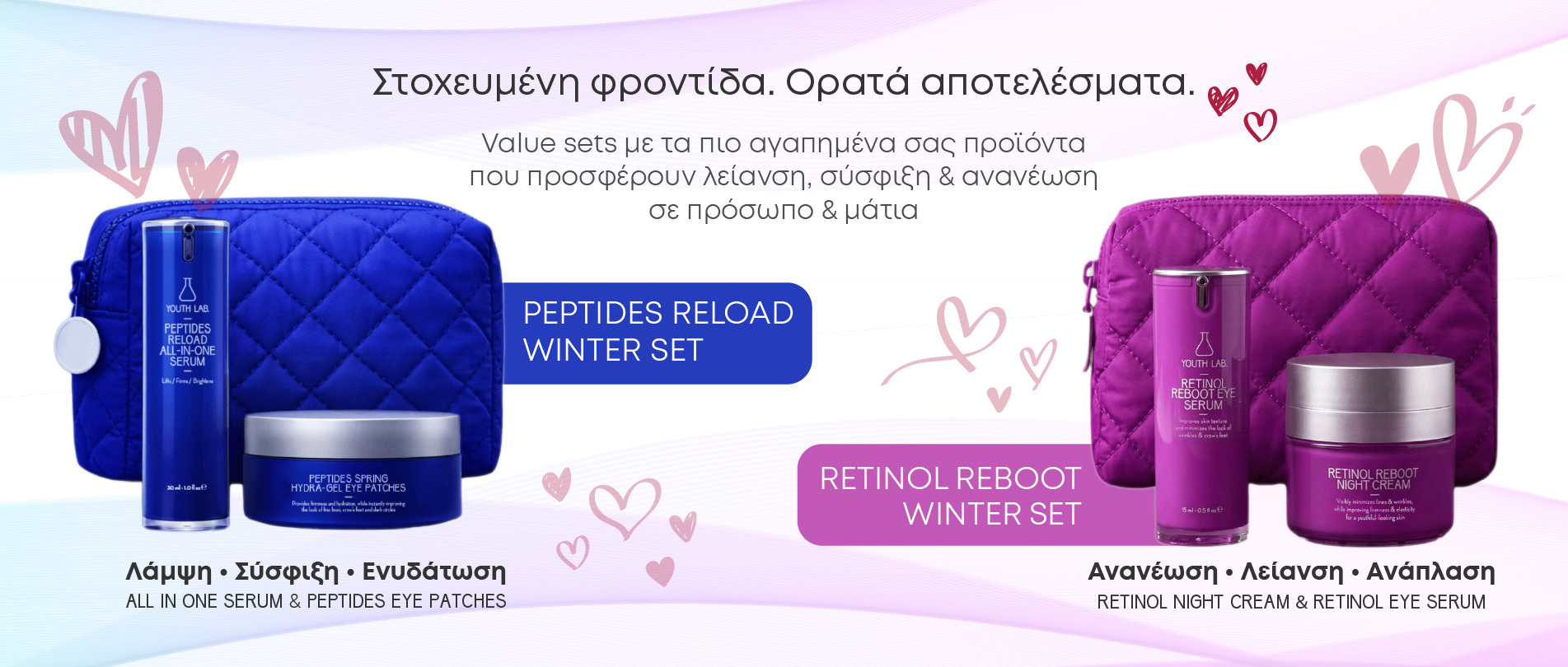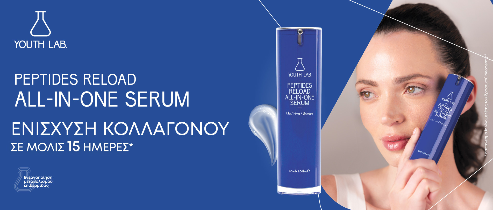 Η επιστημονική ομάδα της YOUTH LAB. αναγνωρίζοντας τη σπουδαιότητα των Πεπτιδίων -δομικό υλικό των συστατικών του δέρματος, όπως είναι το κολλαγόνο και η ελαστίνη- σχεδίασαν τη σειρά Peptides Reload, με σκοπό την ενεργοποίηση των φυσικών μεταβολικών διαδικασιών της επιδερμίδας. Αποτέλεσμα; Η πρόληψη των πρώτων γραμμών και ρυτίδων, αλλά και η αντιμετώπιση των ορατών σημαδιών γήρανσης, όπως βαθιές ρυτίδες, έλλειψη όγκου και πυκνότητας της επιδερμίδας.